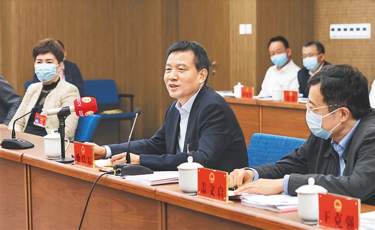 1月21日,参加省六届人大五次会议的代表分组审议政府工作报告。图为徐启方代表参加儋州代表团审议。本报记者 宋国强 摄