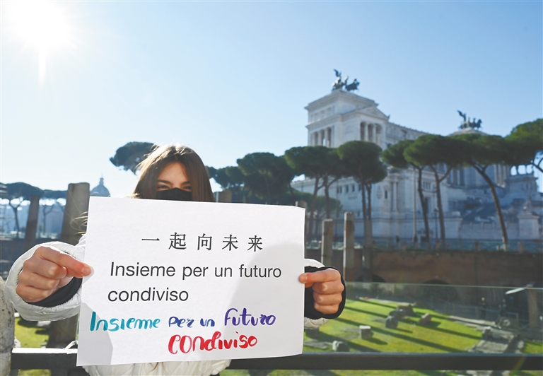 图为在意大利罗马,意大利中学生利维娅手举“一起向未来”的主题口号,祝福北京冬奥会。