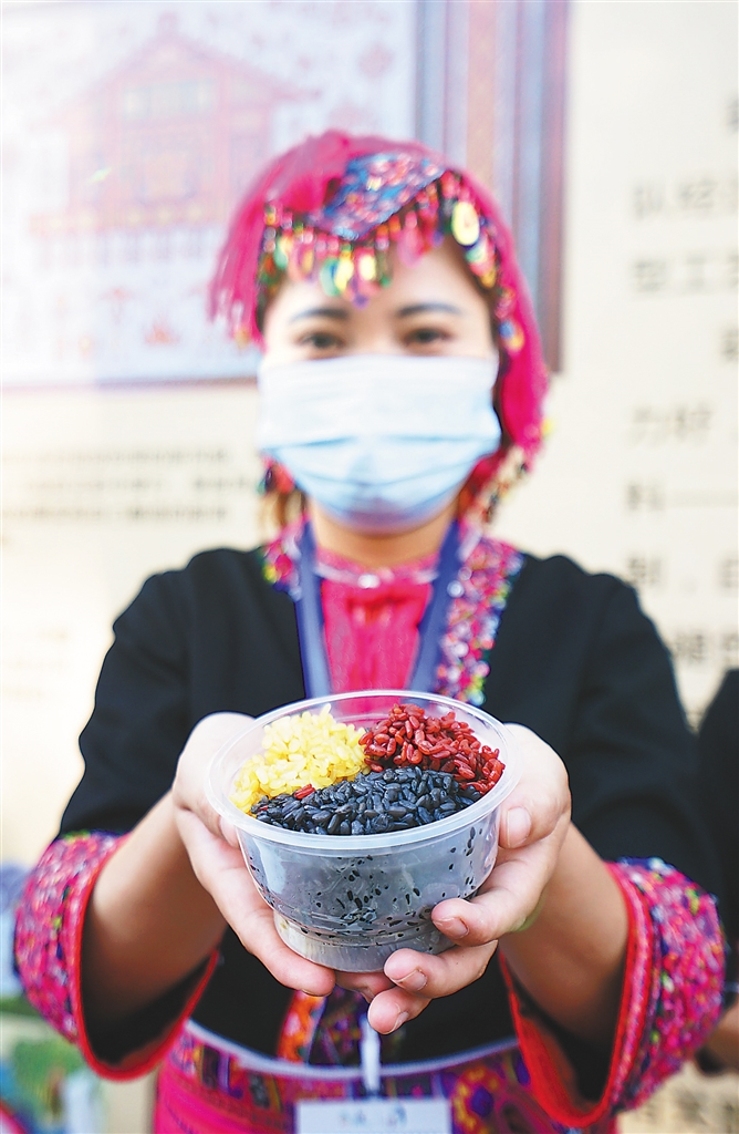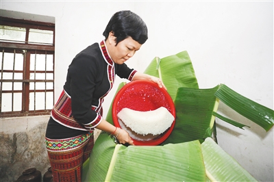 李海英从小在山区长大,寻找染色植物自然不在话下。她介绍,从山上采回三角枫叶和红蓝藤叶后,要冲洗干净,然后逐一浸泡在水里煮汁。黑色和红色汁液准备好后,把糯米倒入汁液中浸泡数小时。至于黄色,需捣碎黄姜,使姜汁流出,然后用姜汁浸泡糯米数小时。待米粒分别穿上了黑、红、黄“外衣”,就可以开始蒸饭了。