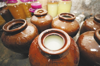 海南日报记者采访时,符美金打开一筐已发酵数天的糯米,只见筐底有一个小孔,乳白色的酒浆正一滴一滴掉入位于筐下方的一个陶罐里,这就是新酒。