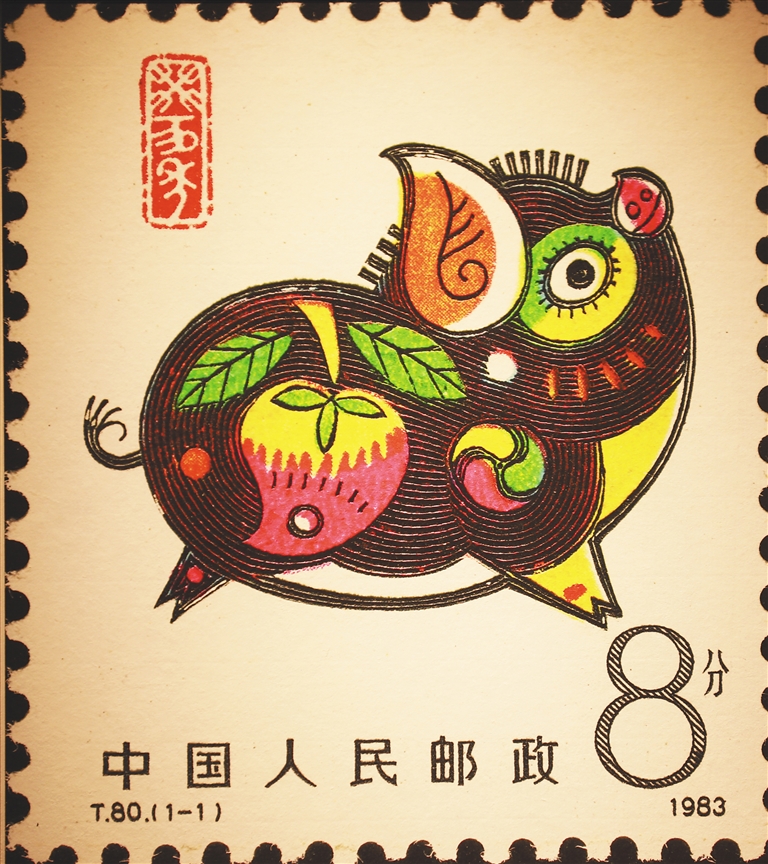 色调艳丽、圆圆胖胖的小猪,憨态可掬,正挺胸抬头,卷翘着细短的小尾巴,前后腿张开,仿佛在向前奔跑。这是1983年韩美林创作的第一轮十二生肖系列邮票中的《癸亥年》特种生肖邮票。韩美林采用民间剪纸和皮影装饰图案,借用红桃元素寓意人寿年丰,富有鲜明的民俗特色。