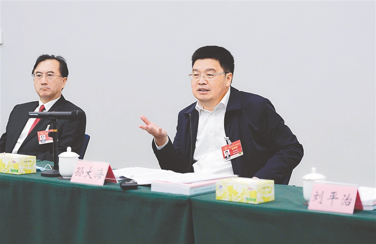 1月21日,参加省六届人大五次会议的代表分组审议政府工作报告。图为孙大海代表参加定安代表团审议。本报记者 王凯 摄