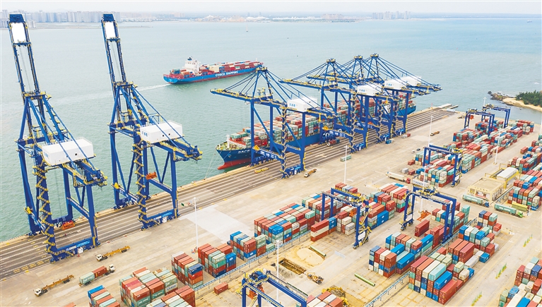 在洋浦国际集装箱码头,车辆来回穿梭、货轮进出有序、桥吊紧张作业,一派繁忙景象。 本报记者 陈若龙 摄