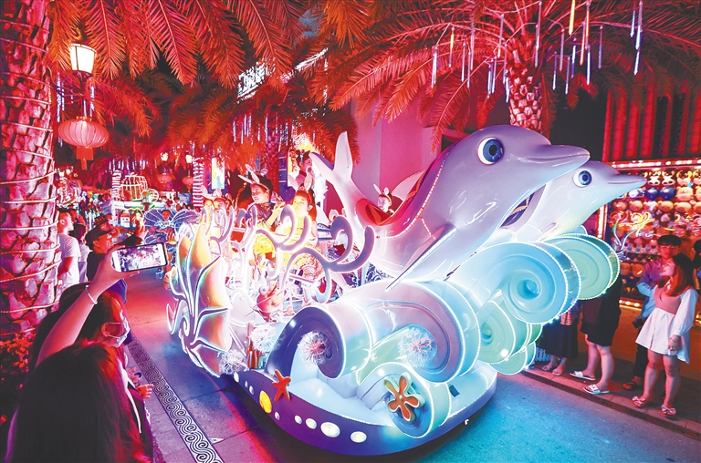 1月22日晚,游客在三亚海昌梦幻海洋不夜城游览,体验各类主题活动。