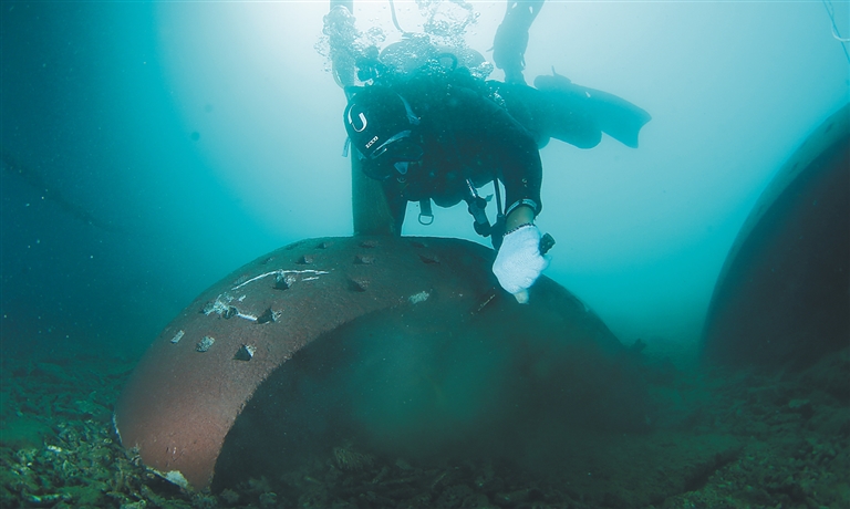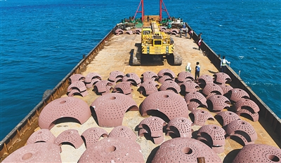 近日,在三亚市亚龙湾相关海域,三亚珊瑚礁生态研究所联合相关企业,在该海域投放近80个人工生态礁,加速生态修复。这批礁体使用一种新型仿生环保材料,有利于珊瑚幼体及其他海洋微小生物附着生长。未来,三亚珊瑚礁生态研究所将在礁体上移植珊瑚苗种,逐渐达到修复该海域珊瑚礁生态系统的目的。 新华社记者 杨冠宇 摄影报道