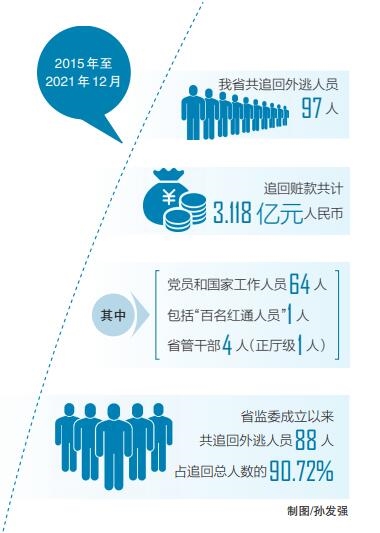 2015年至2021年12月,我省共追回外逃人员97人,追回赃款共计3.118亿元人民币。其中,党员和国家工作人员64人,包括“百名红通人员”1人、省管干部4人(正厅级1人)。省监委成立以来,共追回外逃人员88人,占追回总人数的90.72%。