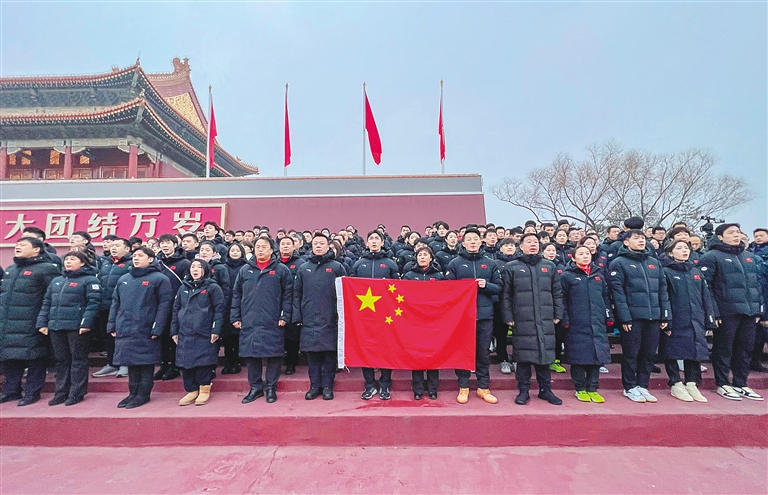 1月25日,在北京冬奥会开幕倒计时10天之际,100余名北京冬奥会中国体育代表团的运动员和教练员代表在北京天安门广场观看升国旗仪式,并进行出征宣誓。