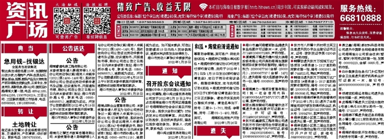 ●但海涛不慎遗失澄迈县后海温泉小镇D幢2311房的购房合同,合同编号:CML000102188,声明作废。
