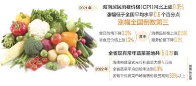 “从统计数据看,2021年海南CPI涨幅创2010年以来的新低,比2020年低2个百分点。”国家统计局海南调查总队一级巡视员陈运兴分析道,受生猪产能持续稳定恢复以及“菜篮子”保供稳价措施得力等因素影响,2021年海南食品价格同比由2020年的上涨10.5%转为下降3.3%,对CPI平抑作用明显。