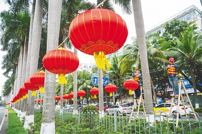 1月26日,在海口市琼山区的红城湖路,工作人员悬挂大红灯笼,营造出喜庆祥和的节日气氛。