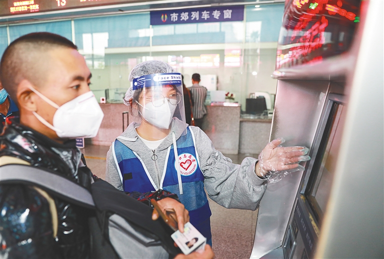 近日,海南师范大学志愿者利用寒假时间,在海口高铁东站提供志愿服务,温暖旅客的回家路。图为志愿者谢愉帮助旅客购票。