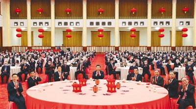 人民大会堂宴会厅张灯结彩、喜气洋洋,各界人士欢聚一堂、共迎佳节,现场洋溢着喜庆祥和的节日气氛。
