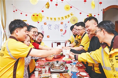 1月29日,海口市琼山区一外卖站点里,骑手们共享欢乐团年饭。本报记者 封烁 摄