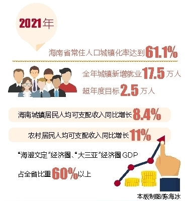 本报讯 (记者傅人意 通讯员黎志琪)2021年,海南省常住人口城镇化率达到61.1%;全年城镇新增就业17.5万人,超年度目标2.5万人;海南城镇居民人均可支配收入同比增长8.4%;农村居民人均可支配收入同比增长11%;“海澄文定”经济圈、“大三亚”经济圈GDP占全省比重60%以上……近日,海南日报记者从省发展改革委获悉,2021年,我省城乡融合取得新进展、百姓福祉不断改善、打造高质量发展新引擎,推动区域协调发展迈出新步伐。