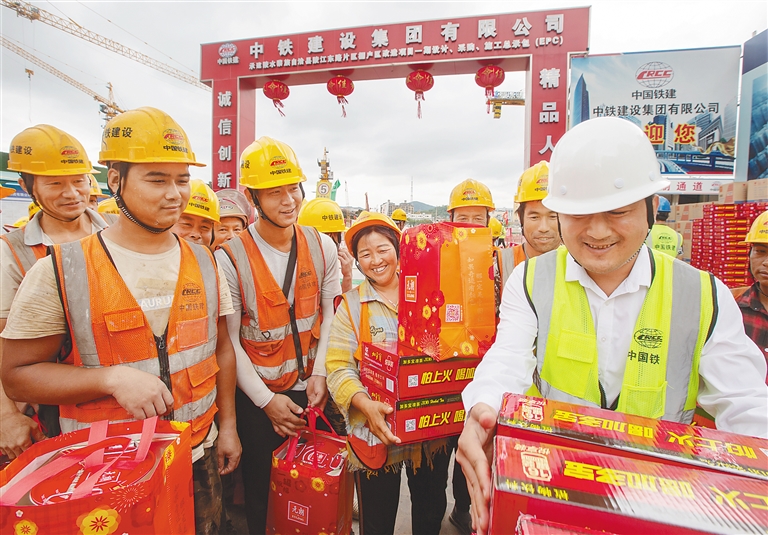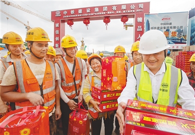 1月31日,陵水黎族自治县陵江东路片区棚户区改造项目一期为留岗工人发放新春大礼包。 本报记者 袁琛 实习生 张芷毓 图/文