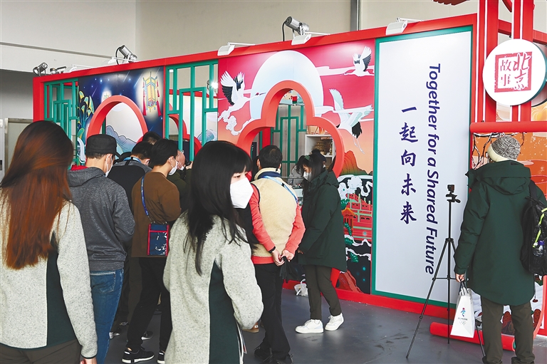 1月31日,位于北京冬奥会主媒体中心二层的“北京故事”展厅举行迎新纳福民俗活动,迎接农历新年到来,吸引众多工作人员、志愿者以及媒体记者前来参观体验。图为参观者到“北京故事”展厅体验。 新华社记者 李紫恒 摄