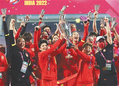 当日,在印度孟买举行的2022女足亚洲杯决赛中,中国队以3比2战胜韩国队,时隔16年再夺亚洲杯冠军。新华社发(更多报道见A08版)