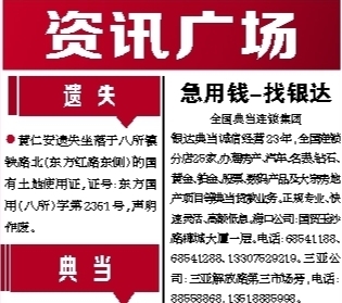 银达典当诚信经营23年,全国连锁分店25家,办理房产、汽车、名表、钻石、黄金、铂金、股票、数码产品及大宗房地产项目等典当贷款业务。正规专业、快速灵活、高额低息。海口公司:国贸玉沙路椰城大厦一层。电话:68541188、68541288、13307529219。三亚公司:三亚解放路第三市场旁,电话:88558868,13518885998。