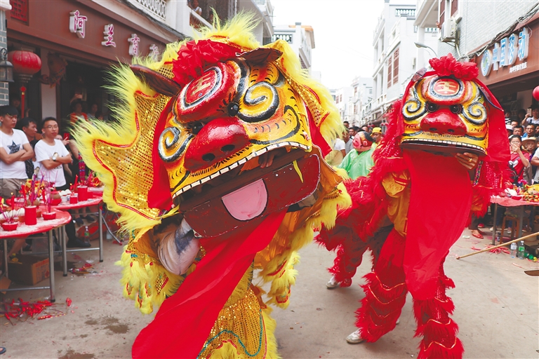 锣鼓喧天,号角声起,在冼夫人纪念馆门前,两只黄色斑纹的“老虎”或嬉戏打斗,或凌空扑咬,或就地翻腾。一旁还有扮作土地公、土地婆的人在跳着秧歌舞应和。气氛正浓时,两名身着绿衣的年轻人走上前,一手抓住虎头,一手作势要打虎,将这一出打虎戏演得虎虎生风……1月24日,海口市美兰区2022年“非遗”集市闹新春线上展播活动开启,前期推出的视频主题便是海南虎舞。