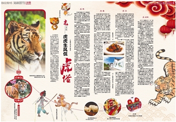 在熟语中,虎可谓“全身都是宝”,虎口、虎皮、虎头都可以作为熟语的素材。人们用“虎头蛇尾”形容做事起初声势浩大,后来劲头全无;用“虎头虎脑”形容小孩长得壮健憨厚;用“老虎嘴里拔牙——找死”说明事情很危险;用“虎口逃生”形容死里逃生。鲁迅先生也有一句话“拉大旗作虎皮”,原指打着革命的旗号来吓唬人、蒙骗人,现在常用于形容借他人抬高粉饰自己。