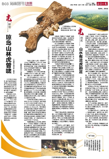壬寅虎年到了,很多与虎相关的元素火了起来。许多人不知道的是,海南有不少虎地名,虎岭、虎坡、虎港、虎角、虎路、虎村,甚至还有几个以虎为名的水库。绿水青山展虎韵,人杰地灵生虎威。这些颇具意蕴的虎地名,流露出海南山水的灵气,亦体现了人们对虎的钟爱。