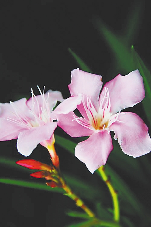 夹竹桃是一种似竹非竹,似桃非桃的花,又称假竹桃、柳叶桃、甲子桃、洋桃梅、枸那。明代植物学巨著《群芳谱》中云:“夹竹桃花五瓣,长筒,瓣微尖,淡红娇艳,类桃花;叶狭长,类竹,故名夹竹桃。”
