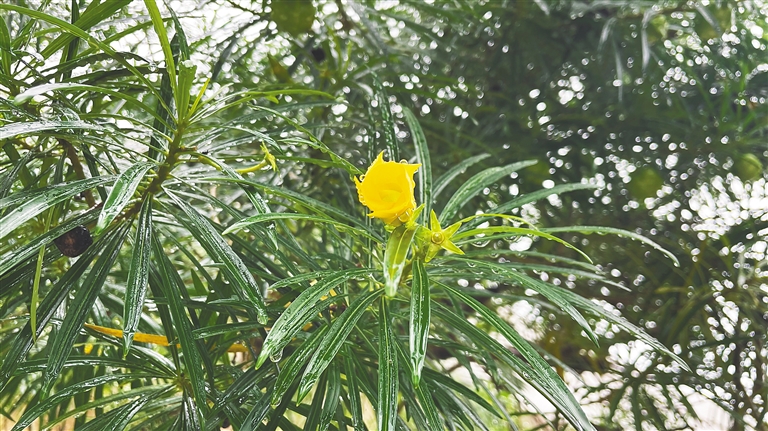 也因此,阳春时节,游人总会不经意间在路边与夹竹桃相遇,其枝干婆娑,一花数蕊,或红似火、或白似雪,百枝齐放,周年不绝。不过,在夹竹桃界,却有位身着黄衣的异类,即“黄花夹竹桃”。
