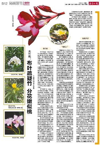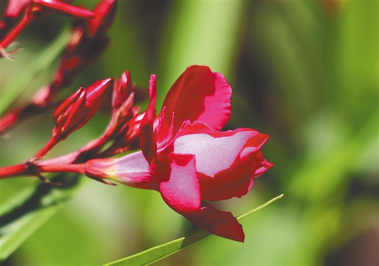 夹竹桃枝叶长青,花影婉美,文人墨客便常以其为题,或写诗、或填词,抒发对它的喜爱。明海南定安诗人王弘诲曾为其作两首五言诗,直言:“别馆多奇卉,幽香此更嘉。”如今,漫步琼岛,道路两旁可见不少夹竹桃树,花朵笼罩满树,像一团云烟,丰盈而饱满,在早春的暖阳下,显得格外明艳。
