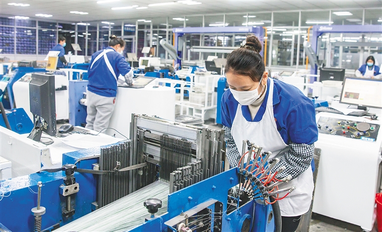 2月7日,在江苏省海安经济技术开发区一家纺织公司,工人在岗位上忙碌。