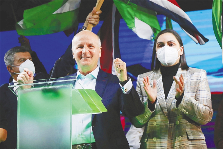 2月6日,在哥斯达黎加首都圣何塞,哥前总统、来自中左翼政党民族解放党的总统候选人何塞·马里亚·菲格雷斯和妻子向支持者致意。