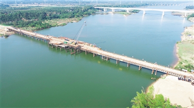 2月10日,横跨万泉河连接琼海市区与海南博鳌乐城国际医疗旅游先行区的乐城大桥项目工地施工正热,施工栈桥连接两岸,施工平台上高高耸立的机械设备吸引着两岸人们的目光。