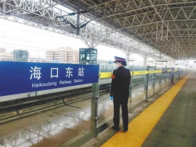 本报海口2月10日讯 (记者邵长春 通讯员唐小飞)2月9日下午,海南环岛高铁海口东站,客运班长刘慧正在站台和车站间巡视,并逐一检查各岗位的防疫消毒情况,当天共有200多趟列车要进出海口东站,一天走下来,刘慧的运动步数记录已接近2万步。