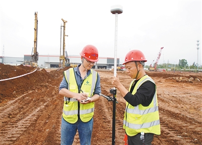 “每一处旋挖机的定位都至关重要,不仅要有固定的距离,而且定点需精确到毫米,不是件简单的事。”刘强负责该项目地基与桩基工程人形定位工作,每天需要早早来到工地上,进行找点、放线、放警示标识工作,他不仅要在这片总建筑面积近9.5万平方米的工地上走很多趟,更要提前计划出当天预计需打孔的区域,随时调动旋挖机进行工作。