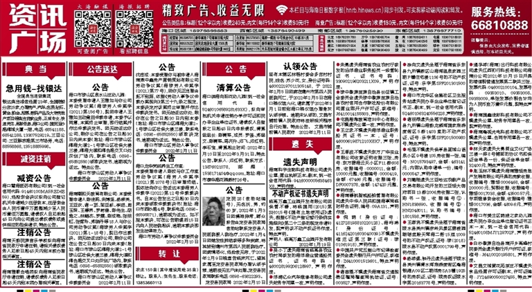 海口滨海向阳花幼儿园(统一社会信用代码:52460106589281633X),拟向审批机关申请注销办学许可证和民办非企业单位证书,请债权人自登报之日起45日内申报债权,清算组组长:陈赛军,成员:罗强、郑涵文、陈赛军、蒋齐升、邓飞、邓红明、李石宝,清算起止时间:2022年2月10日至2022年3月31日。特此公告。联系人:邓红明,联系方式:13876021078,邮箱:1538171404@qq.com,地址:海口市泰华路花园新村26号。