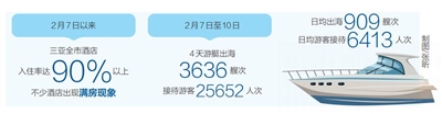 节后三亚游艇出游势头正旺,三亚游艇帆船协会统计数据显示,2月7日至10日,该市4天游艇出海3636艘次,接待游客25652人次。“节后4天游艇每日平均出海909艘次,日均游客接待6413人次,高于春节假日期间的游艇出海日均786艘次,日均游客接待量5659人次。游艇出海和游客接待日平均分别增长了15.65%和13.32%。”该协会副秘书长左志勇说。