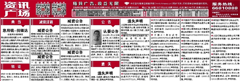 2016年1月16日早上7时,本人在陵水黎族自治县光坡镇港坡书香酒店旁捡拾一名男婴,请该男婴亲生父母或其监护人自公告之日起60日内持有效证件前来认领,逾期将由本人抚养。联系人:胡硕雄,电话:13976251733。