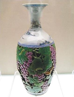据史料记载,早在三国时期就有青釉下彩绘的工艺,当时釉下彩绘颜色为褐黑色。到了唐代,釉下彩瓷工艺进一步发展,四川和湖南等地釉下彩绘以多色为主,浙江和扬州等地釉下彩绘则以青花为主。而真正现代意义的釉下五彩瓷,得追溯到清末湖南省醴陵。下图即为醴陵釉下五彩镂空葡萄花瓷瓶(清宣统),现藏湖南省博物馆。