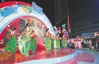 2月12日晚,在三亚蓝海购物广场,演员身着古装为市民游客表演。当晚,三亚国风游园会在这里举行,市民游客换上汉服,参与猜灯谜、射箭、投壶、打卡拍照等趣味游戏。