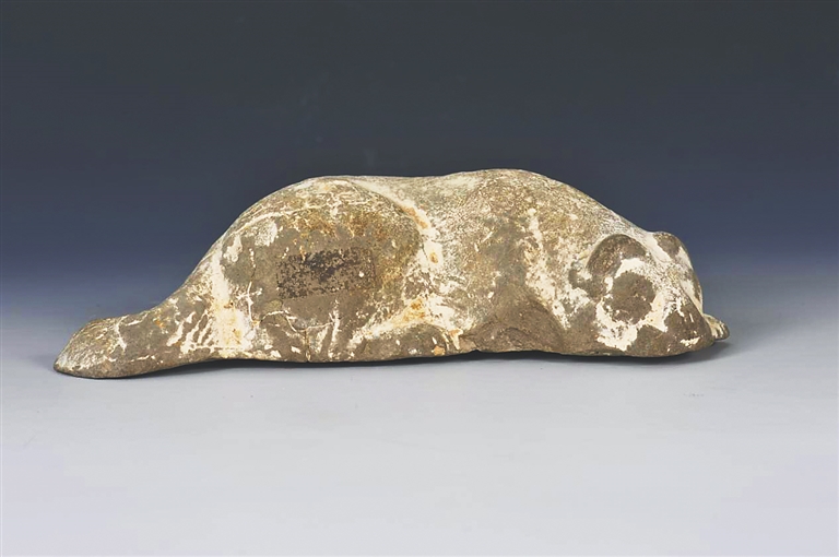 古人认为老虎有阳刚之气,崇拜老虎图腾,常用老虎的形象制作各种器物,也会将虎形构件作为建筑的装饰品,寄托镇宅辟邪、保佑平安的心愿。海南省博物馆的馆藏文物中,有两件灰陶卧虎,时代相同、材质相同,连姿态都如出一辙。这两只“卧虎”体态壮实、腰身宽肥,趴卧在地,一改平常威猛的姿态,多了几分慵懒温和,像是饱餐之后在草地上沐浴阳光小憩。换一个角度看,又好似猛虎下山,潜行匍匐于丛林之中,即将扑向猎物。