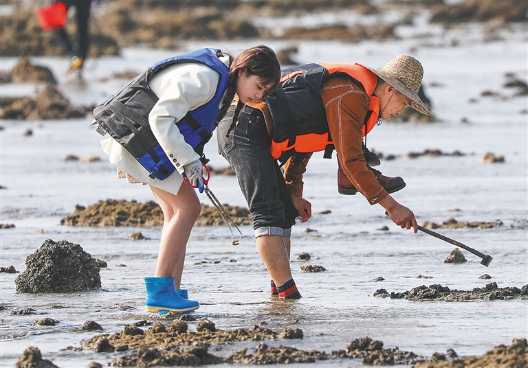碧海蓝天,天气晴好,正是赶海时。今年春节假期期间,儋州市光村镇泊潮村的海边,不少游客拿着小铲子和小水桶,或弯腰,或蹲下,在滩涂处,在石缝间,捡海螺、拾贝壳、抓螃蟹……寻找海鲜美味,体验赶海的乐趣,感受当地渔乡的生活气息。