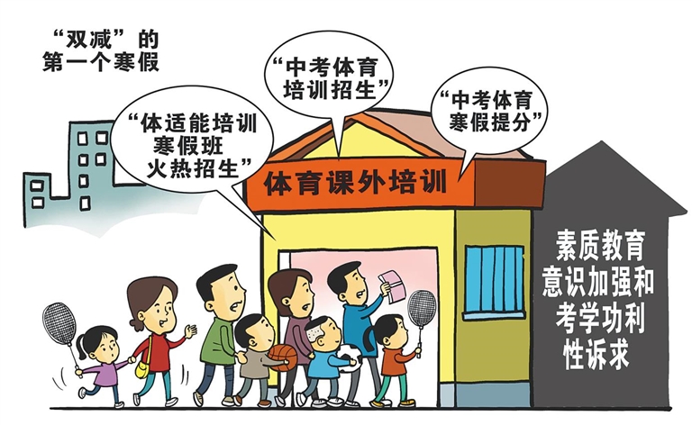 “体适能培训寒假班火热招生”“中考体育培训招生”“中考体育寒假提分”……“双减”政策落地的第一个寒假,各种体育培训广告频频出现,体育培训十分火爆,不少孩子在假期参加了少则一两个多则三四个体培班,一些家长为此付出数千元至上万元的费用。