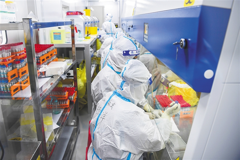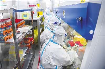 2月13日,工作人员把检测样本添加到扩增反应板上。