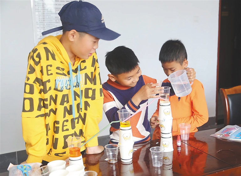 近日,在陵水黎族自治县提蒙乡远景村文化室,村里的孩子们在大学生志愿者的指导下开展科学实验。
