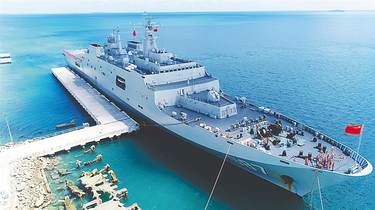 应汤加王国关于火山灾害救援的请求,中国军队派遣海军舰艇于1月31日从广州出发,启运第二批中国援助汤加物资。连续航行5200余海里后,赴汤加执行运送救灾物资任务的中国海军舰艇编队于2月15日抵达汤加努库阿洛法港。此次运送的救灾物资共计1400余吨,主要包括移动板房、拖拉机、发电机、水泵、净水器及应急食品、医疗防疫器材等。新华社发(殷征 摄)