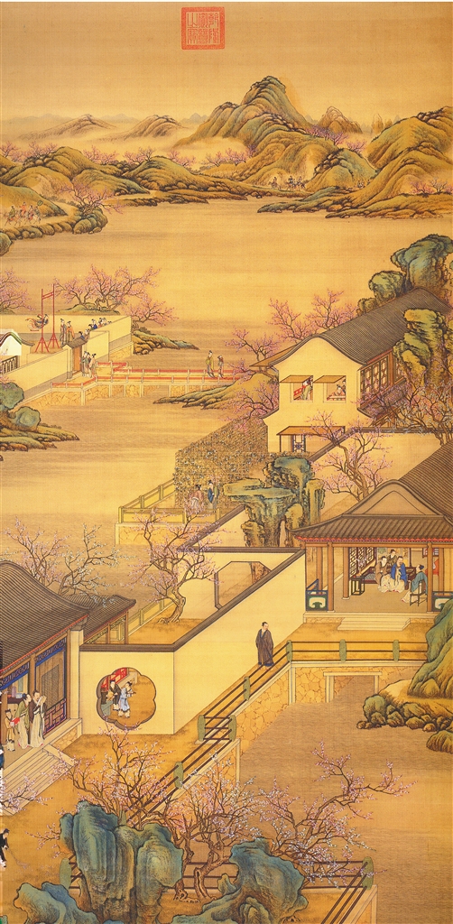 本期《旅游周刊》版面制图参考清院本《十二月令图轴》(二月卷)。《十二月令图轴》据考为清画院画家唐岱、丁观鹏等合作,描绘了十二个月民间具有代表性的生活场景。其中,二月早春,人们纷纷走出户外,踏青嬉戏。男人们骑马登高,女子游园赏花,是古代游春图的经典之作。