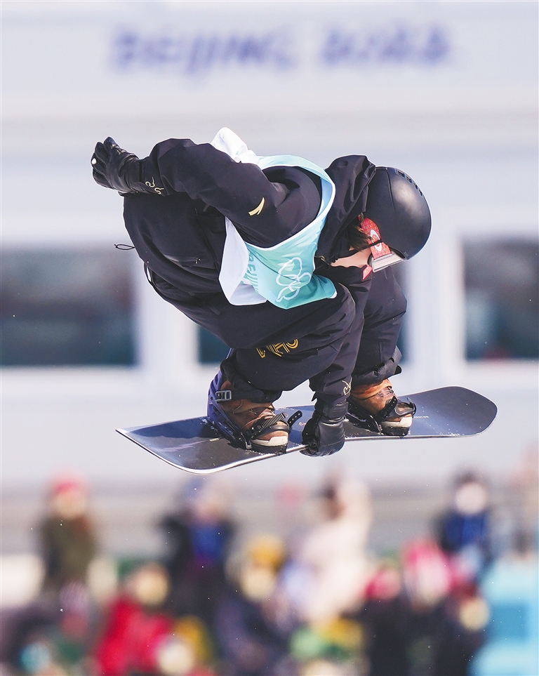 苏翊鸣第三跳出场,只展示了一个轻松写意、难度不大的转体动作,随后激动地滑向靠近观众席一侧宽阔的结束区。没多久后,他在这里站上了领奖台的最高一阶。