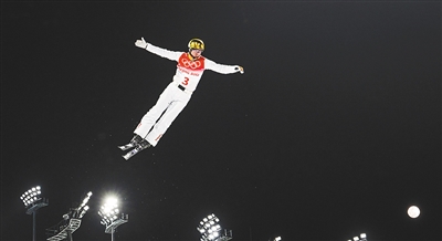 2月15日,元宵佳节,一轮圆月映照张家口云顶滑雪公园,各国选手抓紧时间进行自由式滑雪男子空中技巧资格赛的赛前训练。