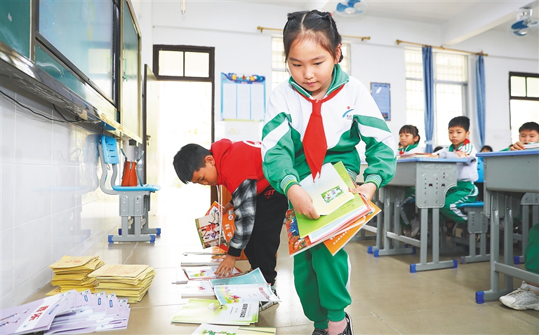 屯昌向阳小学(三区)学生领取教材。本报记者 李天平 摄