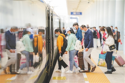 2月16日,在海南环岛高铁棋子湾站,乘客有序排队上车。元宵节后,春运返程客流迎来大流量,我省各地交通枢纽严格落实防疫举措,保障旅客平安出行。