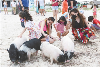 去年,当地官方将海边酒店旁的一片海滩打造成“小猪海滩”,将几只遭到遗弃后被救助的小猪养在海滩上,立刻成为当地网红旅游景点。